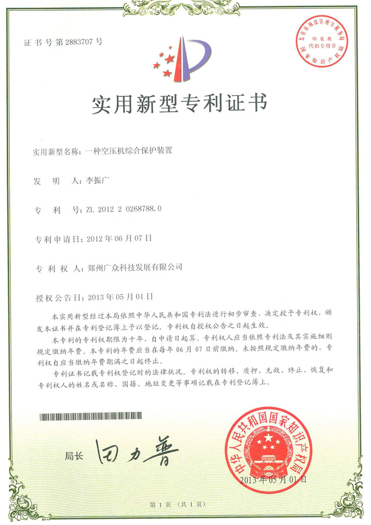 鄭州廣眾科技空壓機(jī)綜合保護(hù)裝置擁有實(shí)用新型專利證書(shū):