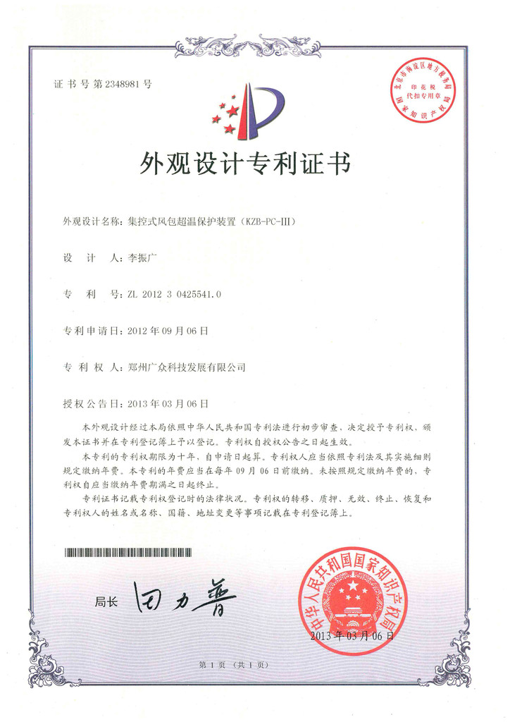 廣眾KZB-PC-III集控式風包超溫保護裝置擁有外觀設計專利