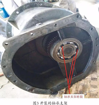 機(jī)動(dòng)維修中心組織鉗工及專業(yè)技術(shù)人員進(jìn)行檢修。檢查發(fā)現(xiàn),機(jī)組盤(pán)不動(dòng)車,空壓機(jī)機(jī)頭一套軸承支架斷裂,如圖所示。使軸承失去原有配合精度,螺桿的軸向竄量和徑向間隙增大,讓螺桿與螺桿之間,螺桿與主機(jī)殼體及前后端面之間的間隙發(fā)生變化,導(dǎo)致機(jī)頭螺桿相互抱死。因此,這是一次因軸承支撐架開(kāi)裂導(dǎo)致空壓機(jī)機(jī)頭螺桿卡死的嚴(yán)重設(shè)備故障。