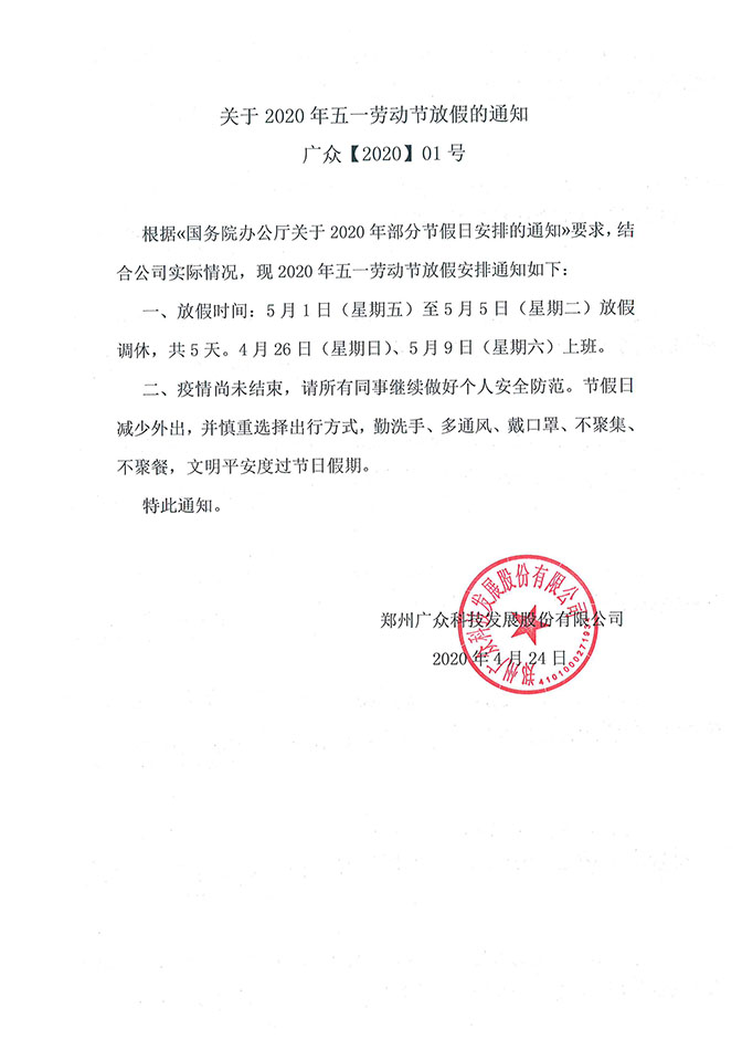 根據(jù)《國務(wù)院辦公廳關(guān)于2020年部分節(jié)假日安排的通知》要求,鄭州廣眾科技發(fā)展股份有限公司結(jié)合公司的實(shí)際情況,現(xiàn)2020年五一勞動節(jié)放假安排通知如下: