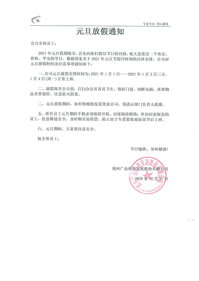 2021年元旦將要來臨,鄭州廣眾科技發(fā)展股份有限公司??蛻襞笥言┛鞓?,萬事如意!如有急事請致電:17337138705
