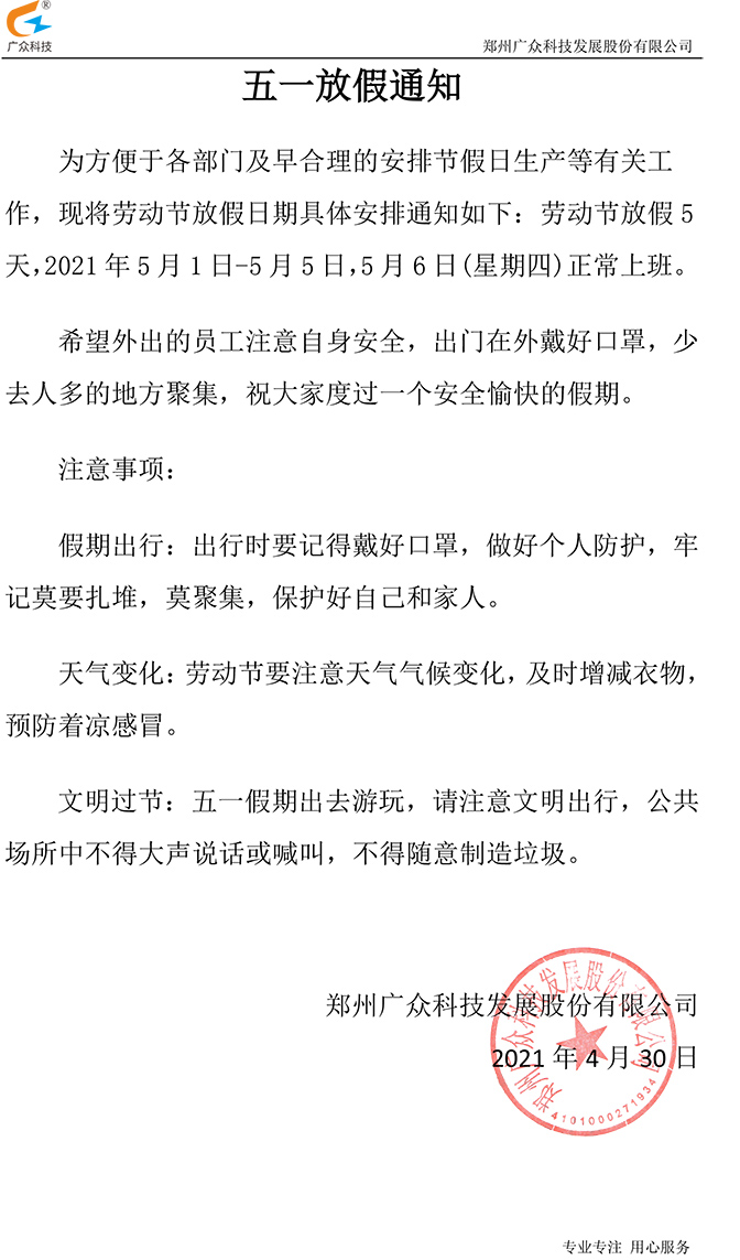 鄭州廣眾科技發(fā)展股份有限公司五一放假通知,期間無(wú)人值班,請(qǐng)廣大朋友知悉,有急事的朋友請(qǐng)電話聯(lián)系:17337138705
