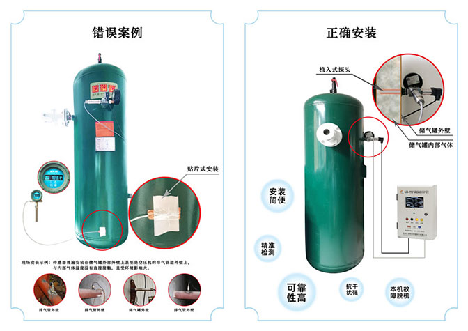 1,儲氣罐打孔不打孔?廣眾科技生產(chǎn)的儲氣罐超溫超壓保護裝置不打孔,保持原有空壓機和儲氣罐本身的結(jié)構(gòu)不改變,在儲氣罐安裝壓力表的位置擰下壓力表,采用長三通、短三通來進行連接溫度傳感器和壓力傳感器,不影響壓力表的安裝。