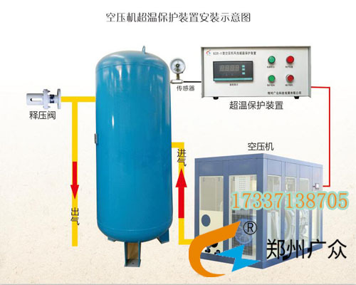 儲(chǔ)氣罐超溫保護(hù)裝置在超溫時(shí)候能自動(dòng)切斷電源并報(bào)警,保護(hù)儲(chǔ)氣罐和空壓機(jī)的正常運(yùn)行,鄭州廣眾科技公司根據(jù)空壓機(jī)特點(diǎn)和要求研制開發(fā)裝置,對(duì)空壓機(jī)儲(chǔ)氣罐溫度超標(biāo)故障時(shí)候進(jìn)行安全保護(hù)監(jiān)控。