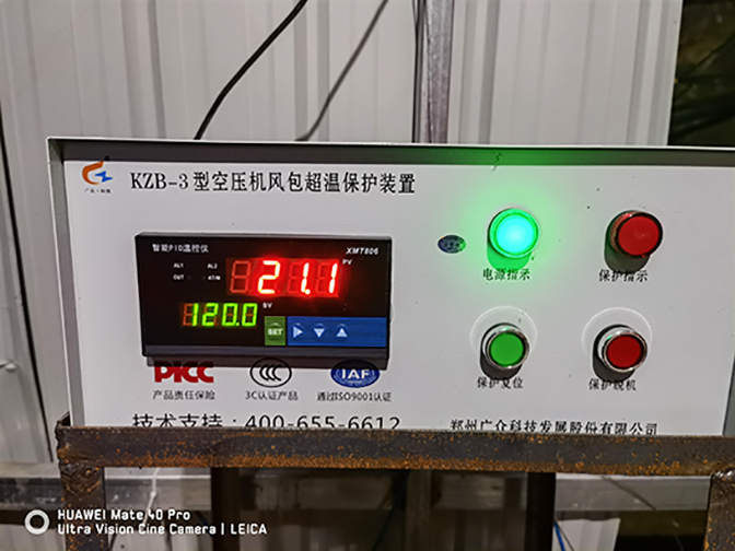 儲氣罐超溫保護(hù)裝置,俗稱空壓機(jī)風(fēng)包超溫保護(hù)裝置,在儲氣罐內(nèi)溫度超過120℃時候,裝置發(fā)出報警聲并切斷空壓機(jī)急停開關(guān),提醒礦方進(jìn)行空壓機(jī)和儲氣罐的維護(hù),以防儲氣罐因為溫度過高發(fā)生爆炸,避免事故的發(fā)生。