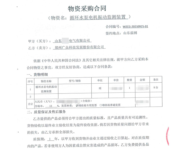 再迎喜訊:鄭州廣眾科技和合作伙伴簽約循環(huán)水泵電機振動監(jiān)測裝置,合作伙伴為山東某電氣有限公司,終端使用為:國家電網(wǎng)廣固換流站。詳情如下: