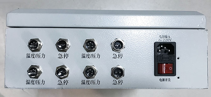 5,急停控制接口為常閉干接點(diǎn)信號,當(dāng)監(jiān)測到溫度和壓力超過報(bào)警值時(shí),該接點(diǎn)斷開,該裝置提供的四路控制輸出各路間均采取了電氣隔離,每路最大工作電流5A。各路接口均采用獨(dú)立的兩芯航空插頭輸出。