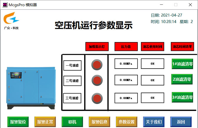一控三空壓機斷油保護裝置,在線監(jiān)測3臺空壓機的運行狀態(tài)(啟停),工作壓力(空壓機冷卻油壓力),可控制3臺空壓機的急停(報警時)。