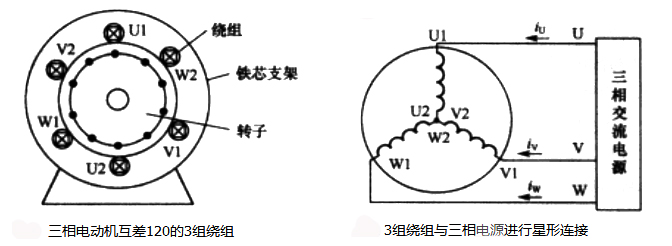 長期實踐和理論證明,如果在轉(zhuǎn)子的圓周空間放置互差120°的3組繞組,然后將三組繞組按星形或三角形接法接好(圖2是按星形接法接好的3組繞組),將3繞組與三相交流電壓接好,有三相交流電流流進3組繞組,這3組繞組會產(chǎn)生類似磁鐵產(chǎn)生的旋轉(zhuǎn)磁場,處于此旋轉(zhuǎn)磁場中的轉(zhuǎn)子上各閉合導(dǎo)體有感應(yīng)電流產(chǎn)生,磁場對有電流流過的導(dǎo)體產(chǎn)生作用力,推動各導(dǎo)體按一定的方向運動,轉(zhuǎn)子也就運轉(zhuǎn)起來。