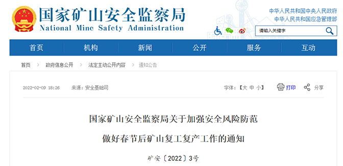 當(dāng)前,北京冬奧會(huì)正在舉行,全國兩會(huì)、北京冬殘奧會(huì)即將召開,加之能源保供壓力大,部分地區(qū)寒潮、雨雪冰凍災(zāi)害嚴(yán)重,礦山安全生產(chǎn)較往年面臨的風(fēng)險(xiǎn)挑戰(zhàn)更大,保安全護(hù)穩(wěn)定要求更高,形勢(shì)更加嚴(yán)峻復(fù)雜。為深入貫徹落實(shí)習(xí)近平總書記關(guān)于安全生產(chǎn)重要指示精神,完整、準(zhǔn)確、全面貫徹新發(fā)展理念,有效防范化解重大安全風(fēng)險(xiǎn),堅(jiān)決遏制重特大事故,確保礦山安全復(fù)工復(fù)產(chǎn),以優(yōu)異成績迎接黨的二十大勝利召開,現(xiàn)將有關(guān)事項(xiàng)通知如下: