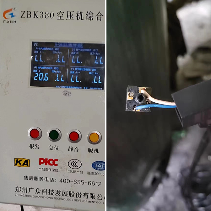 經過中間商和我方人員的詳細溝通,礦方成功安裝了壓力傳感器,ZBK380空壓機綜合保護裝置顯示出了儲氣罐的溫度壓力,安裝任務圓滿完成。