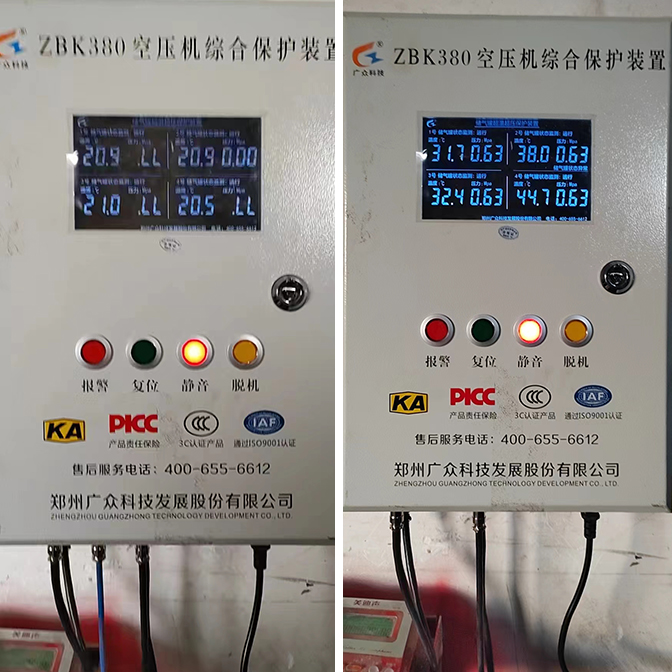 用戶現場有4臺空壓機4臺儲氣罐,每臺空壓機連接一臺儲氣罐,根據煤安規(guī)程要求和當地檢查需求已經實際需要,需要安裝儲氣罐超溫保護裝置,經過中間商和我們以及礦方的詳細溝通,礦方購買了鄭州廣眾科技生產的液晶壁掛型名稱為:ZBK380空壓機綜合保護裝置的超溫超壓型保護裝置,對現場的4臺空壓機4臺儲氣罐進行保護。