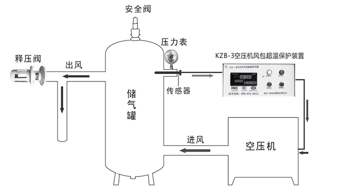 KZB-3型空壓機風包(儲氣罐)超溫保護裝置安裝示意圖如下: