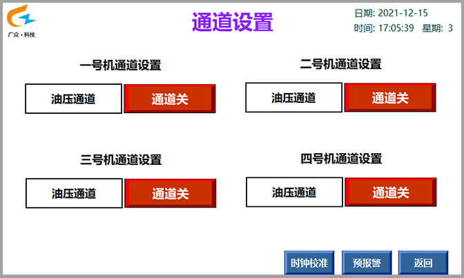 1,下圖是油壓通道設(shè)置。我們可以看到一號機(jī)通道設(shè)置,二號機(jī)通道設(shè)置,一直到四號機(jī)通道設(shè)置。下圖的顯示圖顯示的是“通道關(guān)”,意思是關(guān)閉此通道,相當(dāng)于沒有安裝斷油保護(hù)裝置。例如關(guān)閉一號機(jī),則相當(dāng)于一號機(jī)沒有安裝此裝置,關(guān)閉二號機(jī),相當(dāng)于二號機(jī)沒有安裝此裝置,以此類推。
