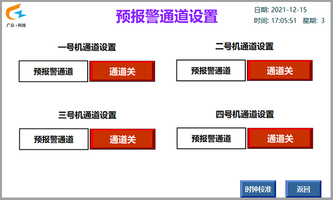 2,下圖是預(yù)報(bào)警通道設(shè)置。我們看到的有一號機(jī)通道設(shè)置,二號機(jī)通道設(shè)置,一直到四號機(jī)通道設(shè)置。下圖的顯示圖顯示的是“通道關(guān)”,意思是關(guān)閉此通道,預(yù)報(bào)警將不起作用。例如關(guān)閉一號機(jī)的預(yù)報(bào)警通道,如果空壓機(jī)斷油保護(hù)裝置監(jiān)測到一號有故障也不會報(bào)警了,以此類推。