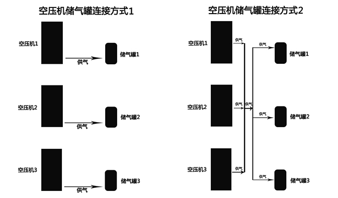 3, 空壓機(jī)和儲氣罐對應(yīng)關(guān)系,以3臺空壓機(jī)3臺儲氣罐為例,連接方式可能多種,下面是最常見的2種: