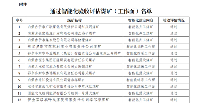 內(nèi)蒙古通過智能化驗收評估煤礦(工作面)名單公布