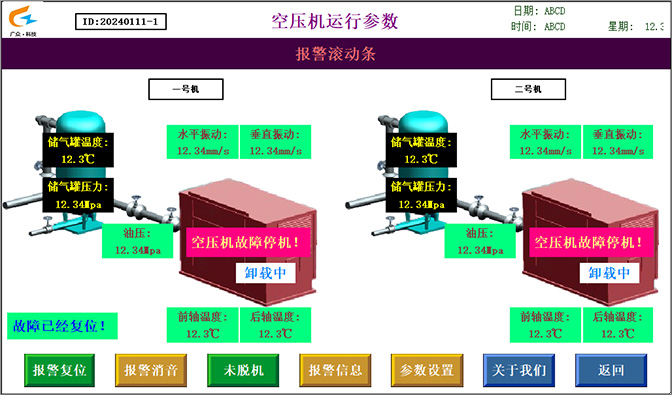 空壓機(jī)斷油保護(hù)綜合保護(hù)裝置功能:對(duì)2臺(tái)空壓機(jī)進(jìn)行斷油保護(hù)功能,對(duì)電動(dòng)機(jī)進(jìn)行軸承溫度振動(dòng)監(jiān)測(cè),對(duì)儲(chǔ)氣罐進(jìn)行超溫超壓保護(hù)等。