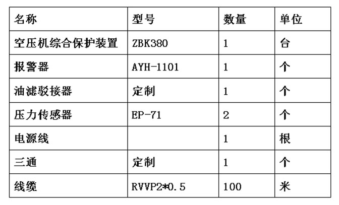 空壓機(jī)斷油斷水保護(hù)裝置,主要配備包含空壓機(jī)綜合保護(hù)裝置裝機(jī),油濾駁接器,壓力傳感器等,見(jiàn)下表: