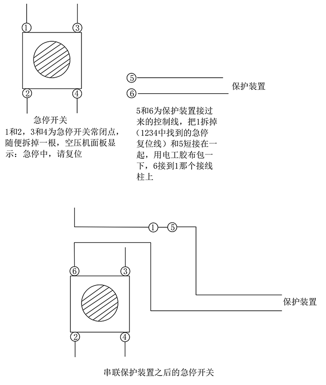 急停開關(guān)上的四個按鈕中,1和2,3和4為急停開關(guān)常閉點,在接線的時候,隨便拆掉一根,空壓機(jī)面板顯示:“急停中,請復(fù)位”的時候,表示拆掉的一根是正確的接線點。