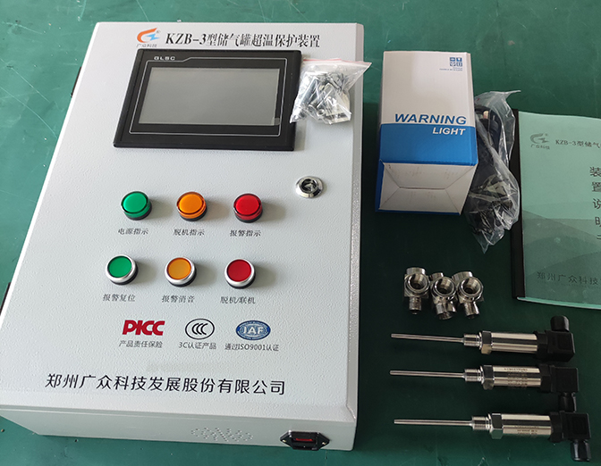 根據(jù)用戶實(shí)際需要,鄭州廣眾科技發(fā)展股份有限公司專業(yè)為用戶定制了一款6臺(tái)空壓機(jī)3臺(tái)儲(chǔ)氣罐用的KZB-3型儲(chǔ)氣罐超溫保護(hù)裝置: