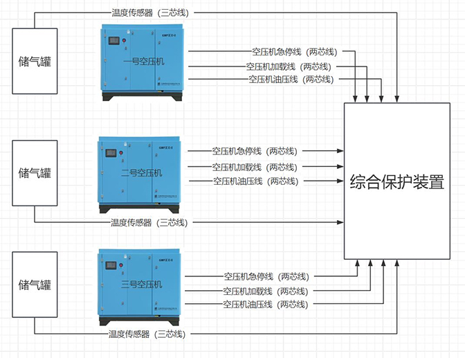 1,每臺(tái)空壓機(jī)上接到ZBK380空壓機(jī)綜合保護(hù)裝置上3根RVVP2*0.5線纜3根,1根為加載線,1根為急停線,1根為測量油壓的壓力傳感器線。